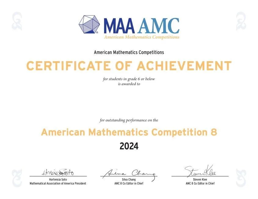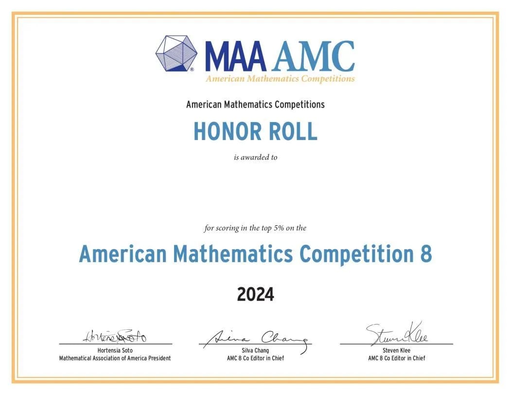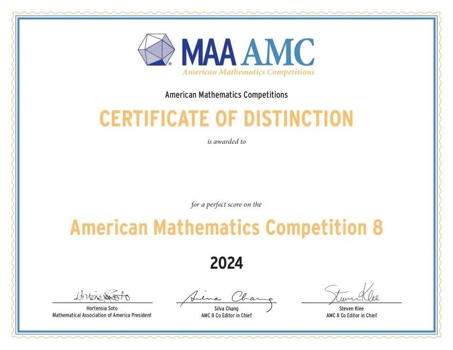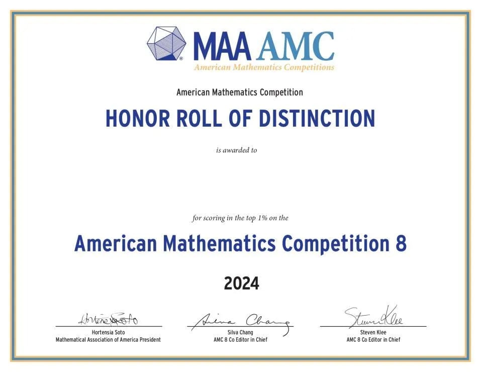 The AMC8 (American Mathematics Competitions 8), organized by the Mathematical Association of America (MAA), is an international mathematics competition designed for students in grade 8 and below. The AMC8 is not only widely recognized in the United States and globally, but it is also a significant advantage for students applying to top universities. AMC8 awards and certificates enjoy high recognition worldwide.